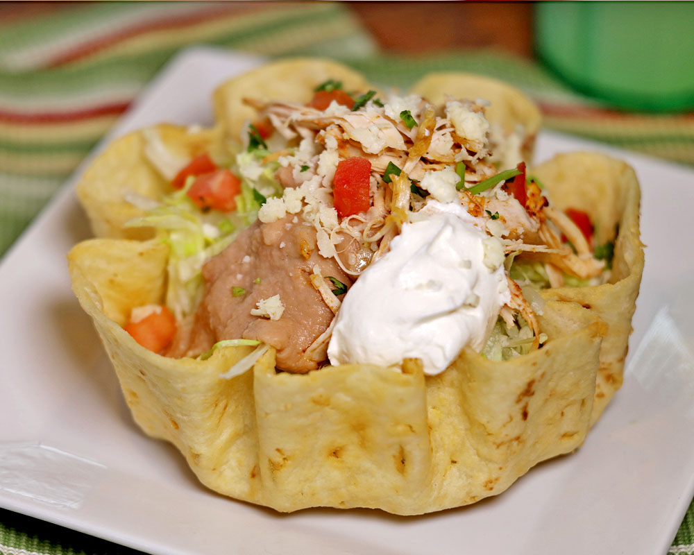 Crispy flour tortilla bowl filled with refried beans and your choice of grilled chicken or steak, bell peppers, onions and tomatoes. Topped with lettuce, shredded cheese, sour cream and pico de gallo.