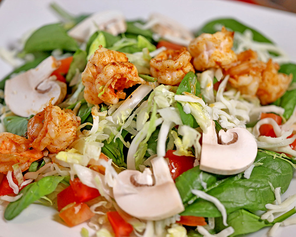 Spinach, lettuce, mushrooms, onions and tomatoes topped with grilled shrimp, shredded cheese and sour cream.